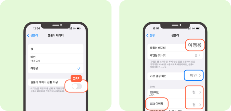 ※ 설정 → 셀룰러 → 셀룰러 데이타 → 여행용(eSIM) 선택